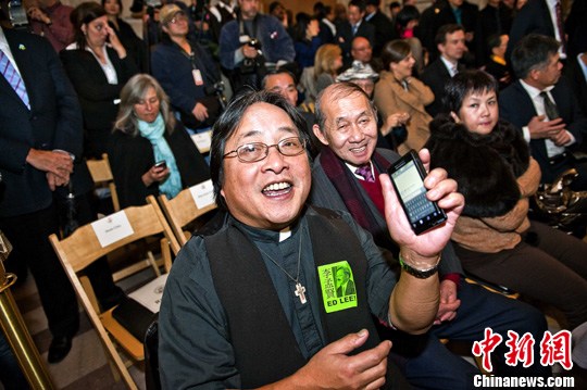图为李孟贤宣誓就任时,和李孟贤相识多年的华埠社区人士,用手机向乡亲报告这激动人心一刻。中新社发 陈钢 摄