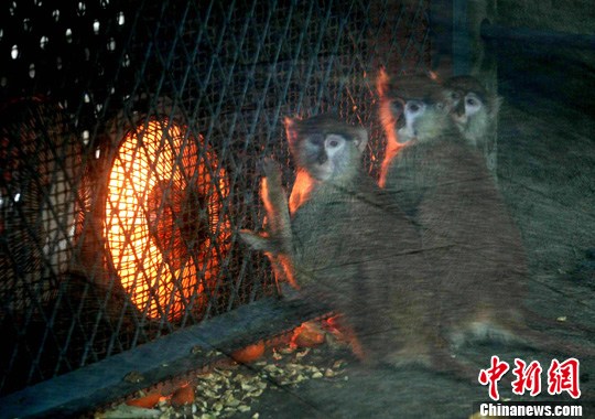1月12日,福州动物园的猴子正围在暖风机前取暖。受到阴雨天气影响,福州当日最低气温为4摄氏度,动物园为许多怕寒的动物上了保暖措施。中新社记者 王东明 摄