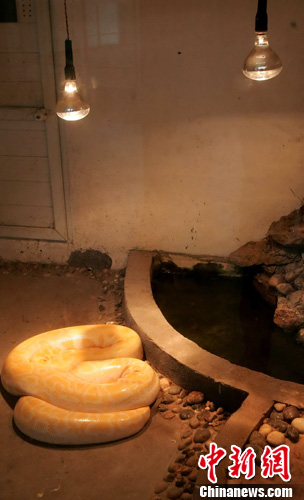 1月12日,福州动物园的黄金蟒在装有浴霸的恒温室里安然冬眠。受到阴雨天气的影响,福州气温骤降,工作人员给怕寒的动物纷纷上了保暖措施,让其安然过冬。中新社记者 王东明 摄