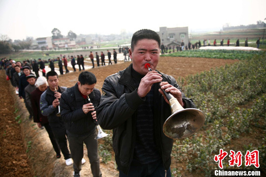 3月8日,四川成都石板滩解放村上演了一场千人祭祖大典,来自四川成都、乐山、自贡等地区的1000多名廖氏家族后代返回家乡祭拜“叔安公”、“明达公”等廖氏先祖。中新社发 张浪 摄
