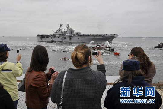 3月23日,在美国弗吉尼亚州诺福克海军基地,亲人们目送“巴丹岛”号两栖攻击舰离港。张军 摄