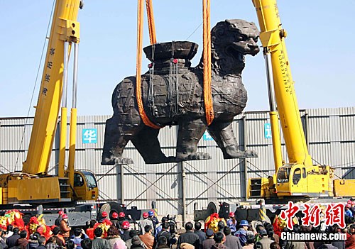 3月25日,一尊重约120吨的全新“沧州铁狮子”运抵河北沧州市狮城公园。据了解,新版沧州铁狮子耗时两年,采用古法泥范铸造与现代铸造技术相结合铸造而成,新铁狮子脱胎于原铁狮子,并补齐了原铁狮子缺失的尾巴和下巴,体积是原铁狮的1.32倍,设计“寿命”2000年。沧州铁狮子又名“镇海吼”,铸于公元953年,是中国现存年代最早、规模较大的铸铁艺术珍品之一,1961年被国务院列为第一批全国重点文物。由于年代久远、破损严重,该市政府决定重铸铁狮子,延续沧州铁狮子的雄姿。图为众人目睹两台大型吊车吊起的新沧州铁狮子。