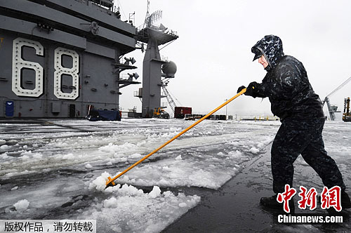 参与互动(0) 1月20日,美国华盛顿州布雷默顿,一名士兵在铲除尼米兹号航空母舰飞行甲板上的冰冻。近日,太平洋西北部遭受暴风雪袭击。