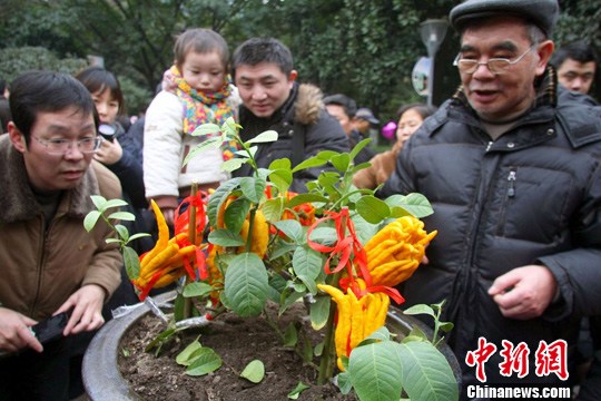 参与互动(0) 龙年春节期间,重庆举办以“龙舞新春”为主题的春花展,展出各类花卉23万株,吸引众多市民走出家门赏春花过春节。图为市民在重庆花卉园观赏名花佛手。中新社发 赵俊超 摄