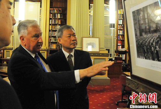 参与互动(0) 图为熊昌良(右一)在澳大利亚维多利亚州下议院议长肯•史密斯的陪同下参观议会图书馆。巫峰 摄