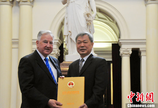 参与互动(0) 图为熊昌良(右一)向维多利亚州下议院议长肯•史密斯赠送礼品。巫峰 摄