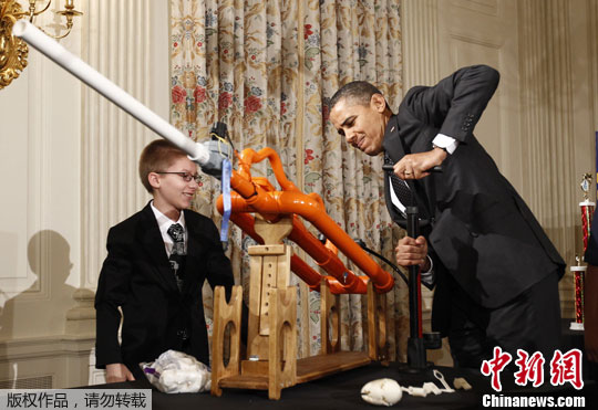 参与互动(0) 当地时间2月7日,美国华盛顿白宫国宴厅,在美国总统奥巴马的帮助下,来自亚利桑那州菲尼克斯的14岁学生乔伊·哈迪(Joey Hudy)在发射他自己发明的“顶级棉花糖大炮”(Extreme Marshmallow Cannon)。