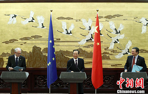 参与互动(0) 2月14日,中国国务院总理温家宝(中)与欧洲理事会主席范龙佩(左)、欧盟委员会主席巴罗佐在北京人民大会堂共同会见记者。当日,第十四次中欧领导人会晤在北京人民大会堂举行,温家宝与范龙佩、巴罗佐共同出席。中新社记者 盛佳鹏 摄