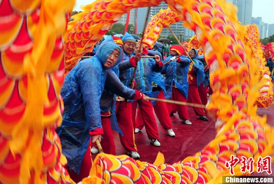 参与互动(0) 2月23日是农历二月初二,是中国民间传统节日“龙抬头”。当天南昌春雨绵绵,在江西南昌秋水广场,南昌民众在雨中擂鼓祈福,舞起长龙,祈求新一年风调雨顺,庄稼丰收,龙年幸福平安。图为舞龙队冒雨舞龙灯。刘占昆 摄
