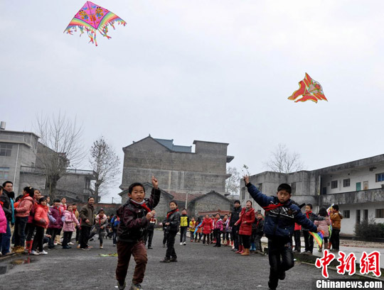 参与互动(0) 2月22日,在江西省德兴市张村小学操场上,小学生放飞着各式各样的风筝。当日,江西省德兴市气温上升至15℃,留守学生利用课间时间到户外迎着和煦的春风放飞风筝,感受春天的快乐时光。图为两名男孩相互奔跑着放风筝。黄鹤 摄
