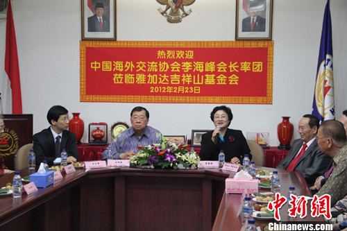 参与互动(0) 当地时间2月23日上午,正在印尼访问的中国海外交流协会常务副会长李海峰一行来到雅加达吉祥山基金会参观访问。中新社发 顾时宏 摄