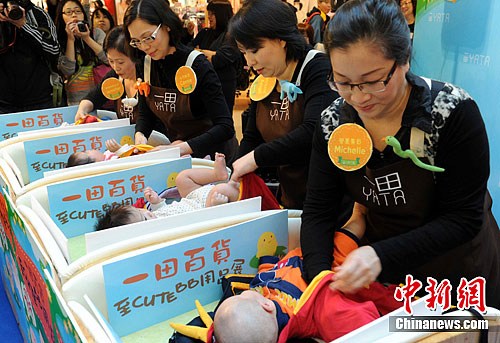 参与互动(0)陪月员技能大比拼--为婴儿穿龙衣。中新社记者 任海霞 摄