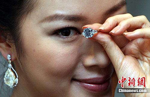 参与互动(0) 2月23日,香港模特手持一颗8.01卡拉方形彩蓝钻指环,拍卖估价9000万至1亿1000万港元。中新社发 洪少葵 摄