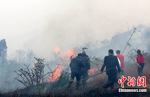 参与互动(0)2月23日下午15时许,重庆大足区雷锋村突发山火,当地村民、消防官兵、公安民警等200余人一起上山扑火。当日下午18时许山火被扑灭。当地林业局负责人称,此次山火过火面积达4万余平方米,被烧毁的森林面积和起火原因正在统计调查中。图为当地村民正在扑火,现场浓烟滚滚。中新社发 渝消防 摄