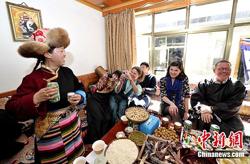 参与互动(0)2月23日是藏历水龙年的大年初二,来自奥地利、美国、新加坡,瑞士和日本的学生们受邀到他们的老师家作客。按照西藏过年习俗,学生们吃卡赛(一种藏式油炸面食)、在切玛(象征五谷丰登的吉祥斗)抛洒糌粑祈福,并围聚在一起,向主人家敬酒,表示庆贺和祝福。图为老师敬酒前,学生们为老师拍照。中新社发 李林 摄
