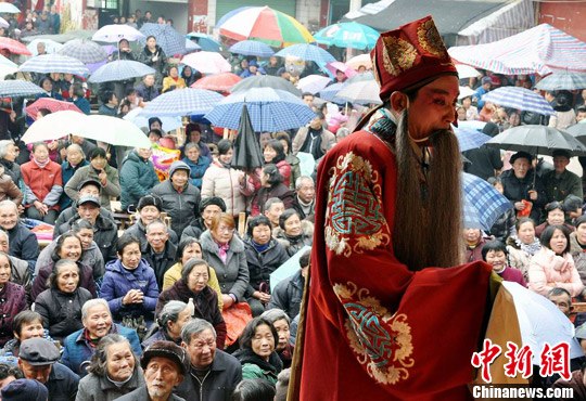 参与互动(0) 2月23日是农历二月初二,江西省德兴民间举行耍龙灯、唱大戏等民俗活动,庆祝“春龙节”。这天,全村男女老少聚集到村口戏台,观看当地戏班的收尾演出,乡戏新春表演即将落下帷幕,农民开始着手备春耕忙生产。图为江西德兴市张村乡村民在观看赣剧演出。 胡敦煌 摄
