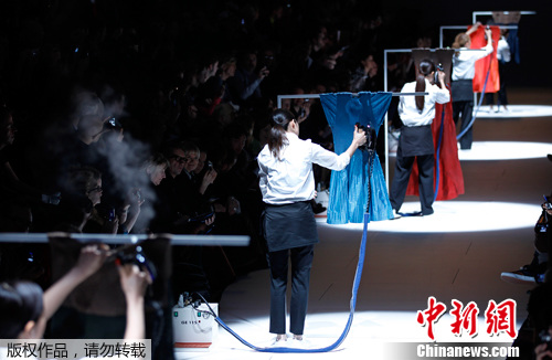 巴黎时装周个性秀场 工作人员T台烫衣模特现场玩变装