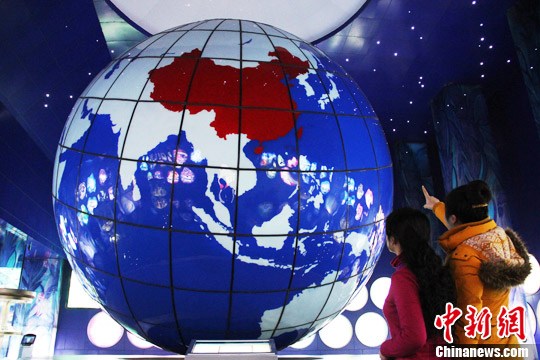 参与互动(0) 近日,直径9米、重19吨的巨型玻璃地球仪在四川省宜宾一家博览馆展示。新研发成功的该玻璃地球仪由288块球形弧度玻璃拼接而成,由于体积过大,不能旋转。据悉,当地近期将为此申报吉尼斯世界纪录。中新社发 徐伟 摄