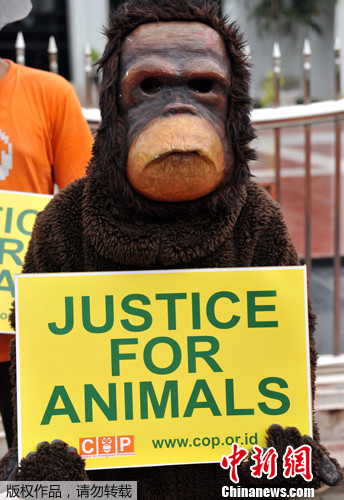 参与互动(0) 2012年3月13日,印尼雅加达,动物保护者在印度尼西亚最高法院门口举行示威,呼吁保护濒危动物。