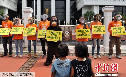 参与互动(0) 2012年3月13日,印尼雅加达,动物保护者在印度尼西亚最高法院门口举行示威,呼吁保护濒危动物。