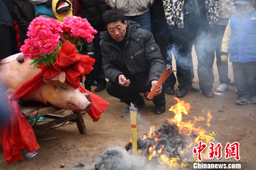 参与互动(0) 3月18日上午,在山东省即墨市田横镇周戈庄,渔民们一大早就把生猪、公鸡、鲈鱼摆在海边上,焚纸烧香,燃放鞭炮,锣鼓齐奏,金龙狂舞,将一年一度的祭海盛会推向高潮。中新社发 徐崇德 摄