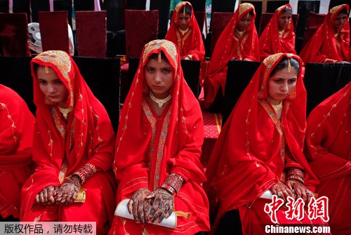 参与互动(0) 2012年3月25日,巴基斯坦卡拉奇,巴基斯坦新人们参加集体婚礼。据报道称有51对新人参加了当地非政府组织为穷人所举办的集体婚礼。