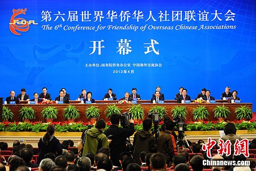 参与互动(0) 4月9日上午,第六届世界华侨华人社团联谊大会开幕式在北京举行,中国国务委员戴秉国出席并致辞,国务院侨务办公室主任李海峰作题为《弘扬中华文化 展示侨胞形象》的主题报告。中新社发 侯宇 摄