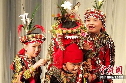 参与互动(0) 4月18日晚,“两岸情·台湾原住民小学传统歌谣会”在南京大学大礼堂拉开帷幕。图为部落头目的婚礼。吴瞳 摄
