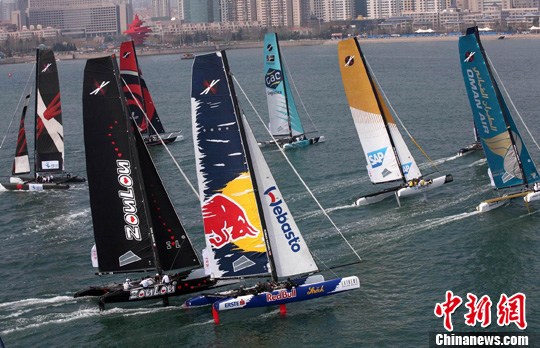 参与互动(0) 2012国际极限帆船系列赛青岛站“双星杯”比赛4月19日下午在青岛在浮山湾进行了第二场港内比赛。经过三日激战,阿曼浪潮马斯喀特帆船队勇超红牛队,夺得总分第一,暂居榜首。中新社发 徐崇德 摄