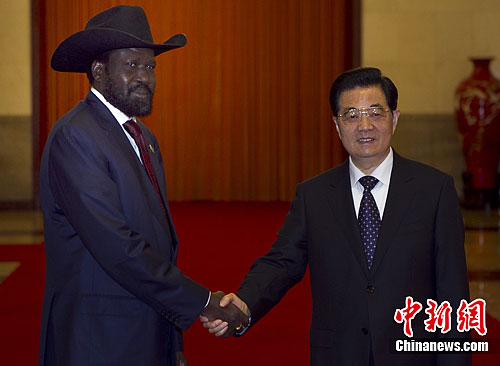 4月24日,中国国家主席胡锦涛在北京人民大会堂欢迎南苏丹总统萨尔瓦·基尔访华。中新社发 任晨鸣 摄