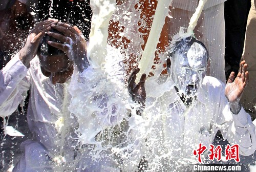 当地时间2012年4月25日,印度新德里,奶农举行示威活动狂泼牛奶,抗议降低牛奶销售价格。图片来源:东方IC 版权作品 请勿转载