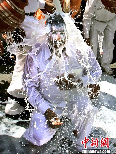 当地时间2012年4月25日,印度新德里,奶农举行示威活动狂泼牛奶,抗议降低牛奶销售价格。图片来源:东方IC 版权作品 请勿转载