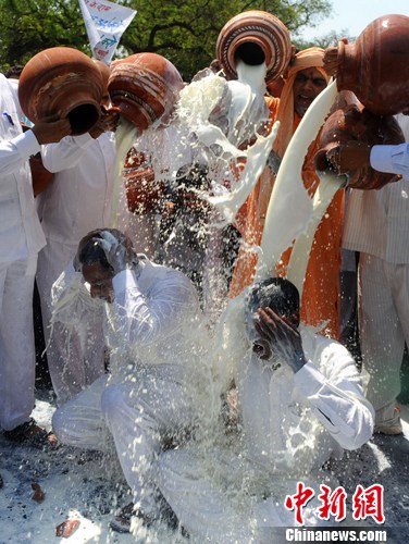当地时间2012年4月25日,印度新德里,奶农举行示威活动狂泼牛奶,抗议降低牛奶销售价格。图片来源:东方IC 版权作品 请勿转载