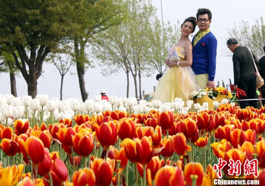 图为郁金香花海吸引游人驻足欣赏。王娇妮 摄