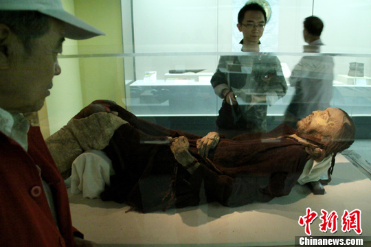 5月3日,在山西博物馆举办的“天山往事——古代新疆丝路文明展”上,一具距今已2800年的“且末男尸”吸引了民众的目光。中新社发 韦亮 摄