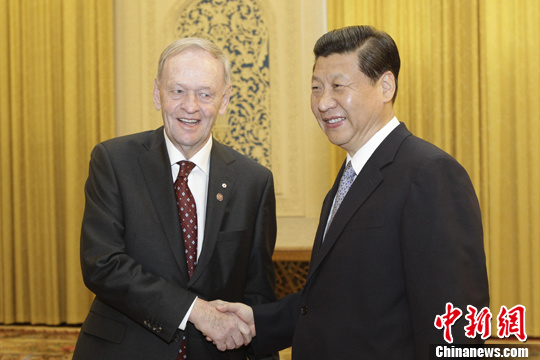 5月9日,中国国家副主席习近平在北京人民大会堂集体会见国际行动理事会成员。图为习近平与理事会主席、加拿大前总理克雷蒂安握手。中新社发 盛佳鹏 摄