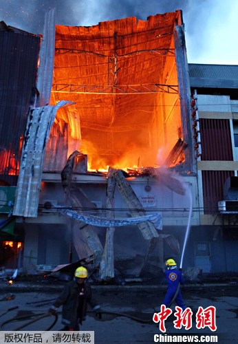 5月9日,在菲律宾南部北阿古桑省武端市,消防员在火场救火。菲律宾警方9日说,该国南部北阿古桑省武端市的一家商场当天凌晨发生火灾,迄今已造成18人死亡,至少4人被困。