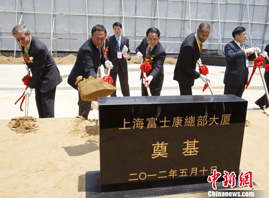 5月10日,由台湾鸿海——富士康科技集团投资兴建的上海富士康大厦开工动土奠基仪式在浦东陆家嘴金融贸易区举行。富士康集团总裁郭台铭(左二)等出席仪式。中新社发 潘索菲 摄
