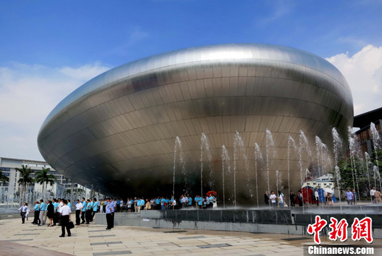 5月15日,深圳华侨城文化产业展及湿地公园开园在欢乐海岸举行,中共广东省委常委、深圳市委书记王荣、华侨城集团总裁任克雷等出席。图为新建成的深圳欢乐海岸标志建筑OCT创意展示中心。 中新社发 陈文 摄