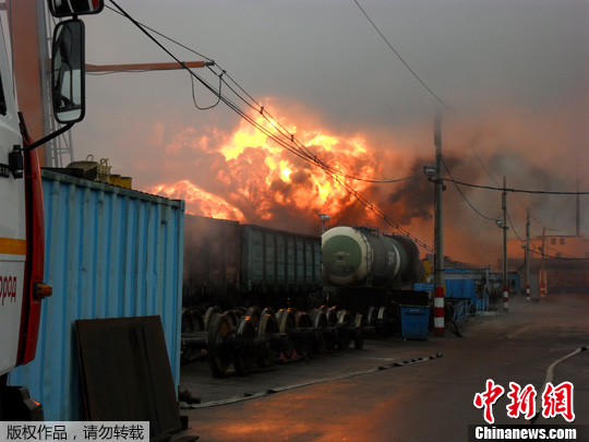 俄罗斯一油罐列车起火 大火冲天