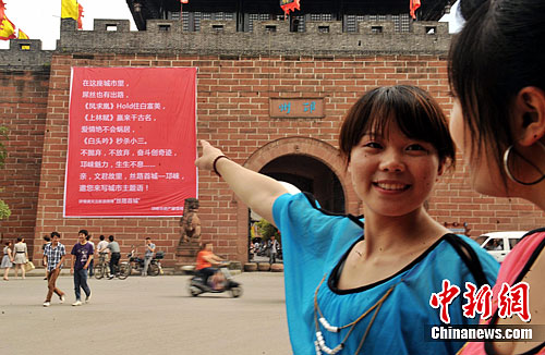 5月30日,一巨幅海报出现在成都市邛崃中心城区古城墙上,海报上“秒杀小三”、“Hold住白富美”等一些网络语吸引不少过往路人驻足围观和讨论。图为海报吸引路人围观和讨论。中新社发 刘忠俊 摄