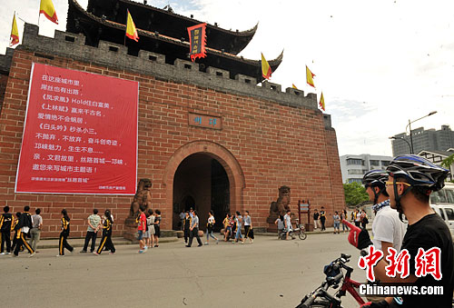 5月30日,一巨幅海报出现在成都市邛崃中心城区古城墙上,海报上“秒杀小三”、“Hold住白富美”等一些网络语吸引不少过往路人驻足围观和讨论。图为海报吸引路人围观和讨论。中新社发 刘忠俊 摄