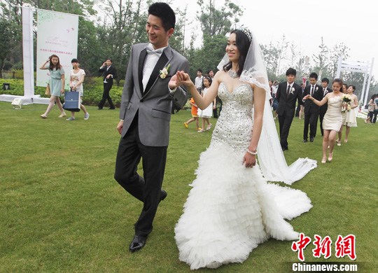 6月10日,身着婚纱礼服的模特在草坪上举行仪式。当天傍晚,“婚享世纪·因爱有礼”高端婚礼品鉴会在南京世茂滨江希尔顿酒店举行,来自皇家婚礼的专业模特倾情演绎浪漫的婚礼进行曲,和现场观众分享最美一刻。泱波 摄