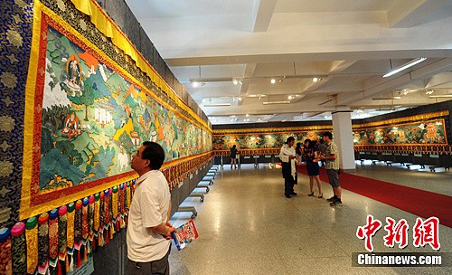 6月18日,长达30米的大型历史题材卷轴唐卡《凉州会盟》在甘肃兰州展出,这幅手绘唐卡长卷再现了13世纪西藏纳入祖国版图的历史场景。中新社发 杨艳敏 摄