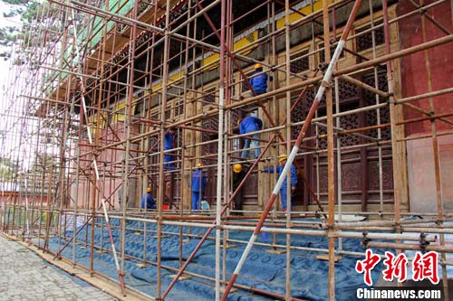 图为承德避暑山庄及周围寺庙文化遗产保护工程重要项目之一——承德“外八庙”中的普乐寺大殿正在修缮中 。张帆 摄