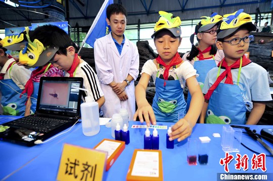 6月27日,北京海洋馆举办了第十二届 “海洋小卫士”科普夏令营的开营仪式。图为孩子们在体验分析水质实验。中新社发 陆欣 摄