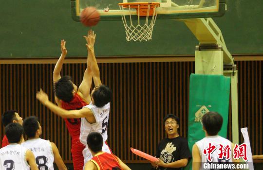 一名观众正在为争抢篮球的选手们呐喊助威。泱波 摄