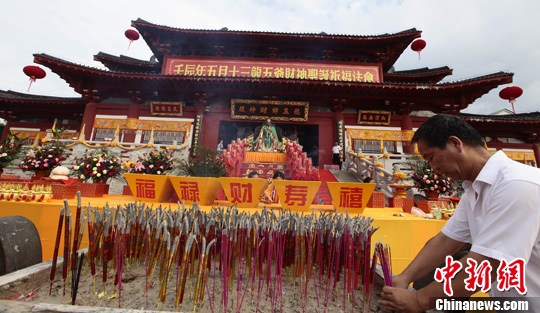 图为游客在三亚南山三十三观音堂拜“财神”龙五爷祈福。中新社发 陈文武 摄