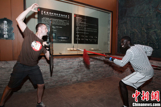 7月1日下午,两名外国游客在山西平遥古城西大街一座中国古兵器文化研究展览馆参观,对中国古代冷兵器文化产生浓厚的兴趣。图为两名外国游客演绎中国古代“自相矛盾”的寓言故事。中新社发 张云 摄