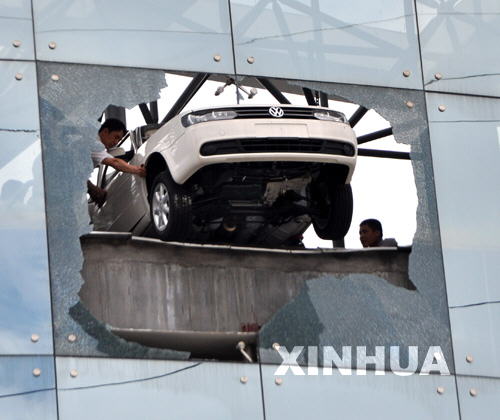 参与互动(0) 7月1日,在广西柳州市燎原路一家汽车销售店,一辆小轿车撞穿玻璃墙后部分车身悬在4楼高空。新华社发 李书厚 摄